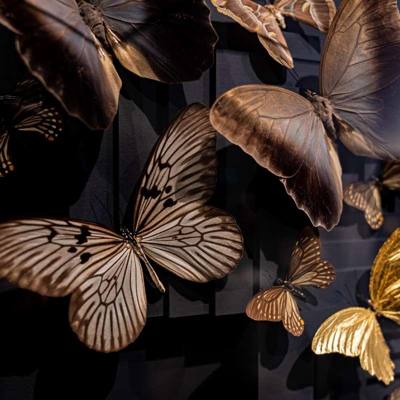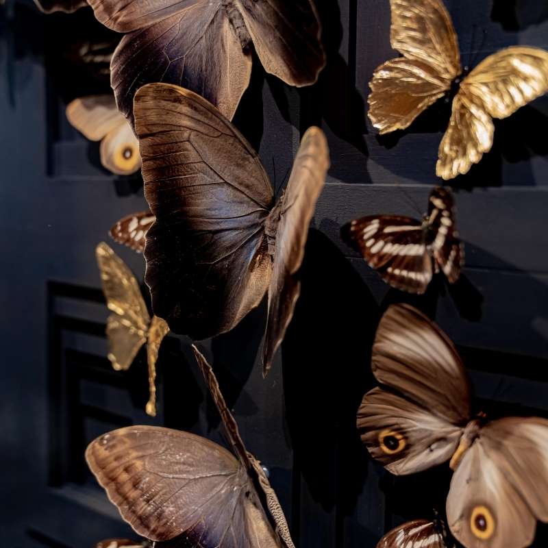 The combined action of tout, graphic lines and shapes and the organic, detailed shapes of the butterflies. The gentle, delicate butterflies show the soothing effect of the beauty of nature on a harsh, straightened environment. The organic form of the butterflies softens the harsh, geometrical lines. The other way around the taut, graphic lines make the butterflies pop out in all their beauty. Extremes intensify one another. Powerful in its simplicity, these artworks are both suited as statement pieces or in a serie.