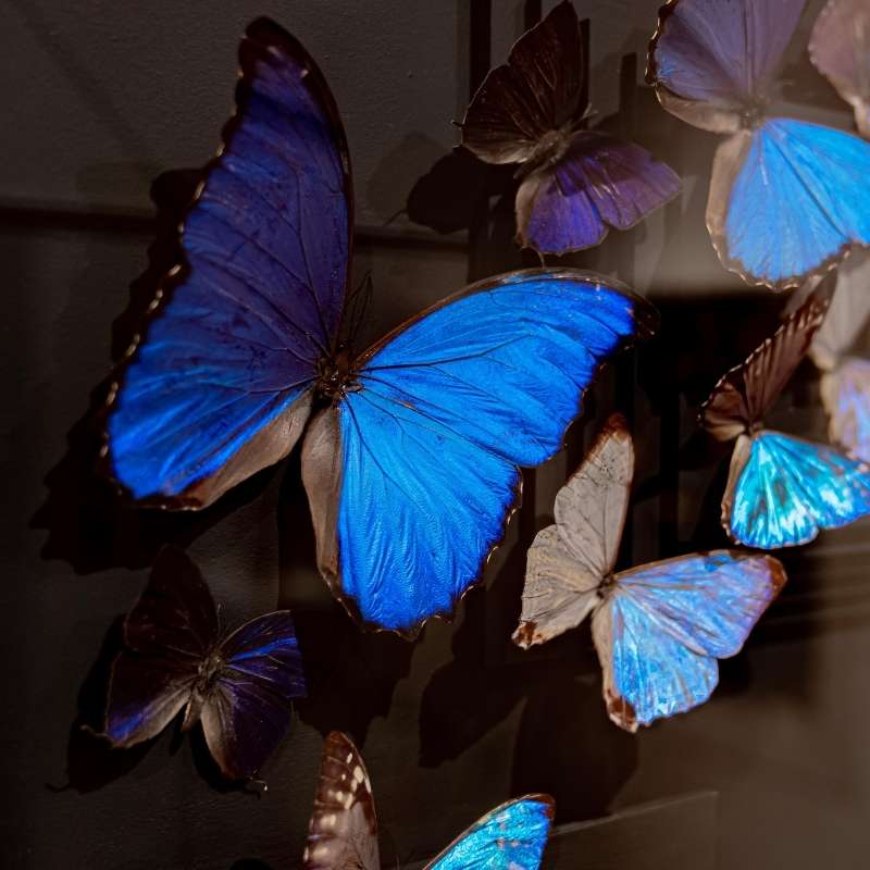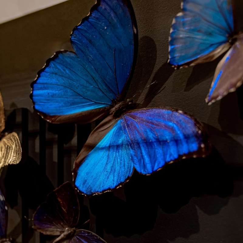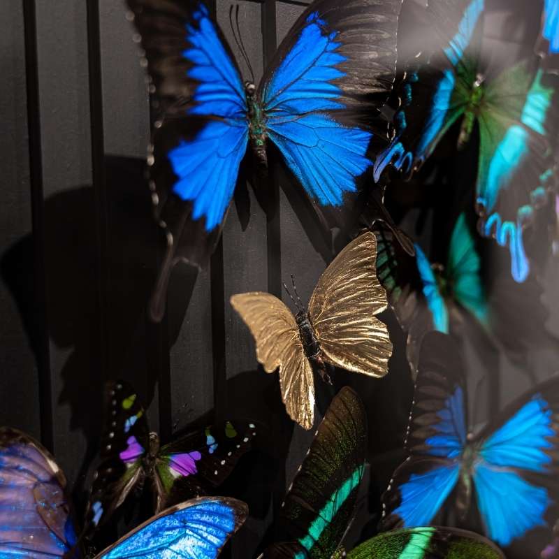 The combined action of tout, graphic lines and shapes and the organic, detailed shapes of the butterflies. The gentle, delicate butterflies show the soothing effect of the beauty of nature on a harsh, straightened environment. The organic form of the butterflies softens the harsh, geometrical lines. The other way around the taut, graphic lines make the butterflies pop out in all their beauty. Extremes intensify one another. Powerful in its simplicity, these artworks are both suited as statement pieces or in a serie.
